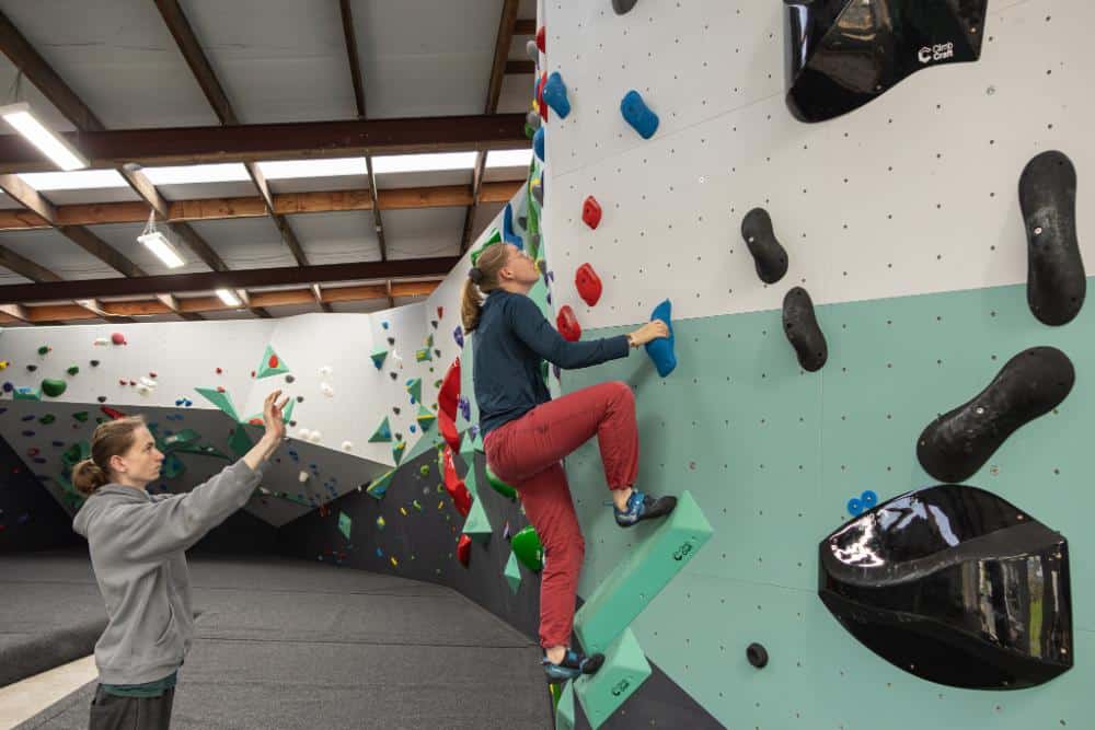 Climbing shoes are best (you can bring your own or hire them here), and socks are a good idea for comfort. Bring a water bottle to stay hydrated, and maybe a light jumper for chilling between climbs.